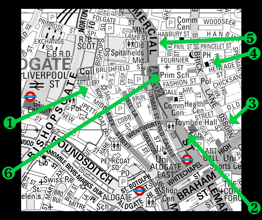 Turn left along Hanbury St. At the end of the street we reach