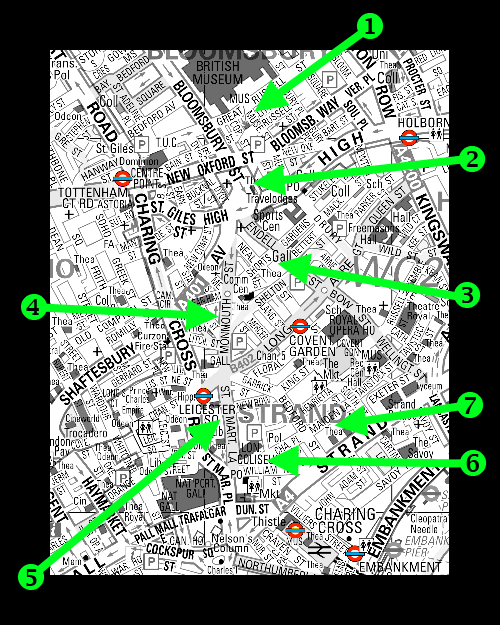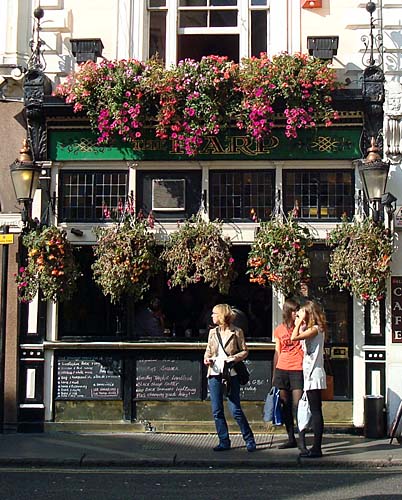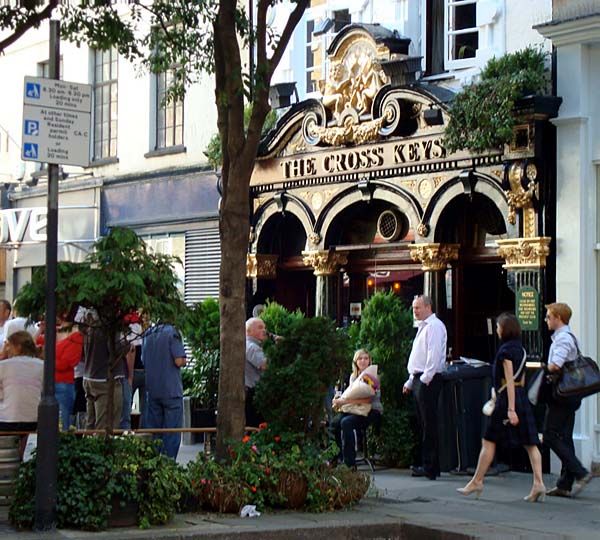 Turn left out of the Bloomsbury Tavern and go down Shaftesbury Avenue, taking note of the location of the Grape Street Wine Bar famous for decades for Jules' popular Last Wednesday gathering. Go past the Oasis Sports Centre and down Endell Street to the Cross Keys (under all the vegetation). |